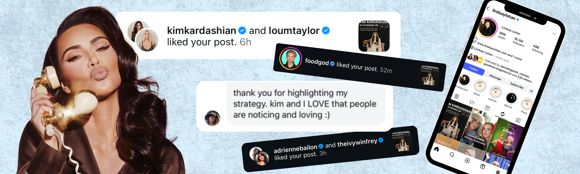 Earlier this month, JMG PR experienced this firsthand. One of our Instagram carousel posts about Kim Kardashian’s shift from traditional reality TV to TikTok vlogging went viral. It resonated with our audience, and celebrities like Adrienne Bailon-Houghton, Lindsay Lohan, Jonathan Cheban, and Kim Kardashian herself engaged with it with likes and reposts. This is how it got massive visibility across social media.